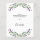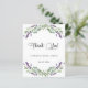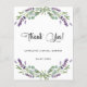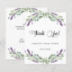 Um cartões de agradecimentos para um Chá de panela. Um fundo branco chico decorado com flores lavandas e verde de eucalipto. Na frente, um grande script de cor preta, escrito à mão, e o texto: Obrigado, seu e uma data. Voltar: Personalize e adicione seu nome e nota de agradecimento.