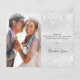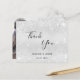 Um cartões de agradecimentos de casamento. Uma cor de fundo metálica de aparência fina prateada. Com poeira falsa. À frente, um grande texto escrito à mão e o texto: Obrigado, seus nomes e uma data. Voltar: personalize e adicione sua foto de casamento, obrigado nota e nomes.