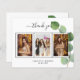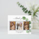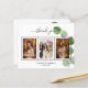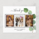 Adicione 3 das suas fotos de aniversário, tamanho vertical, uma data, nome e a nota de agradecimento. Um fundo branco chic com texto e quadro preto, um som de eucalipto. O texto: Obrigado na parte frontal e seu nome no verso é escrito com um roteiro à mão com na moda com baloiços.
