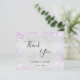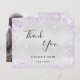 Um cartões de agradecimentos de casamento. Uma cor de fundo metálica de aparência fina prateada. Com poeira brilhante púrpura. À frente, um grande texto escrito à mão e o texto: Obrigado, seus nomes e uma data. Voltar: personalize e adicione sua foto de casamento, obrigado nota e nomes.
