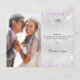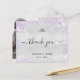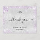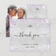 Um cartões de agradecimentos de casamento. Uma cor de fundo metálica de aparência fina prateada. Com poeira brilhante púrpura. À frente, um grande texto escrito à mão e o texto: Obrigado, suas iniciais do monograma, nomes e uma data. Voltar: personalize e adicione sua foto de casamento, obrigado nota e nomes.