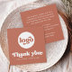 Cartões de agradecimentos comercial quadrado com o texto "Obrigado" em uma fonte com estilo retroativo. Texto branco (ou cor personalizada) sobre fundo marrom-terracota. Carregue seu logotipo na frente e adicione texto personalizado na parte traseira. Você pode alterar cores, mover e redimensionar elementos com a ferramenta design.
