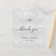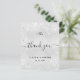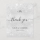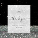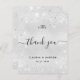 Um cartões de agradecimentos de casamento. Uma cor de fundo metálica de aparência fina prateada. Com poeira falsa. À frente, um grande texto escrito à mão e o texto: Obrigado, suas iniciais do monograma, nomes e uma data. Voltar: personalize e adicione seu aviso de agradecimento e nomes.