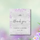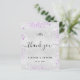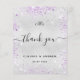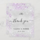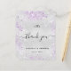 Um cartões de agradecimentos de casamento. Uma cor de fundo metálica de aparência fina prateada. Com poeira brilhante púrpura. À frente, um grande texto escrito à mão e o texto: Obrigado, suas iniciais do monograma, nomes e uma data. Voltar: personalize e adicione seu aviso de agradecimento e nomes.