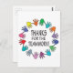 Obrigado pelo trabalho em equipe com um círculo de mãos em cores brilhantes para uma mensagem de reconhecimento e apreciação da gerência para o funcionário, professor para os alunos ou treinador para a equipe.