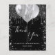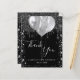 Um cartões de agradecimentos para um aniversário de 18 anos (ou qualquer idade). Uma cor preta de fundo chic. Com um pouco de brilho prateado, pintura pingando aparência e balões. Na frente, o texto com letras grandes e o texto: Obrigado, seu texto, título e uma data. Voltar: Personalize e adicione sua nota de agradecimento e seu nome.