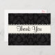 Diga obrigado com estilo! Estes elegantes cartões-postais de agradecimento apresentam um padrão Damask vitoriano preto e cinza com uma borda branca de renda "Obrigado" contrastante.