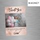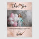 Uma cor de fundo rosa dourada, decorada com veias rosa douradas. Escrita escrita com letras grandes com baloiços e o texto: Obrigado. Personalize e adicione sua foto, obrigado nota e nome.