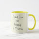 O design amarelo pálido da caneca que caracteriza as palavras "agradece-lhe para Beeing um amigo" em um lado, e um bonito bumble a abelha no outro. As palavras podem ser personalizadas a o que quer que você deseja.