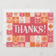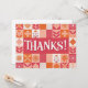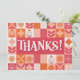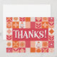 Expresse sua gratidão em estilo com este vibrante Obrigado! Apresentando letras brancas ousadas em um histórico alegre de retalhos de padrões florais e geométricos cor-de-rosa, corais e laranja, este design é perfeito para as notas de obrigado que você faz depois de eventos como casamentos, aniversários, chás de fraldas ou simplesmente para mostrar apreciação.