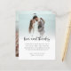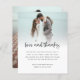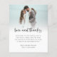 Orçamento 2 Foto Bold Script Obrigados De Amor De Casamento. Um alternativo MENOR de 4,5" x 5,6", compatível com o orçamento. Disponível em um STOCK de PLACA SEMI GLOSS 110 lb ou um STOCK de PAPEL THINNER SATIN FINISH 80 lb. O amor e os obrigados estão em um estilo manuscrito ousado. Personalize facilmente o resto do texto para seus próprios detalhes e substitua a foto de amostra pelo seu favorito do dia.