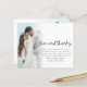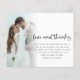 Obrigados De Amor De Casamento De Foto Do Projeto Budget 2. Um alternativo MENOR de 4,5" x 5,6", compatível com o orçamento. Disponível em um STOCK de PLACA SEMI GLOSS 110 lb ou um STOCK de PAPEL THINNER SATIN FINISH 80 lb. O amor e os obrigados estão em um estilo escrito à mão. Personalize facilmente o resto do texto para seus próprios detalhes e substitua as fotos de exemplo na frente e atrás por suas próprias. Adicione seu código QR à galeria online de fotos de casamento no verso substituindo o código QR na amostra. Você pode criar códigos QR gratuitamente on-line, pesquisar 'gerador de códigos QR'.