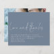 Obrigados De Amor Com Escrita Orçamental Foto De Casamento Obrigado Dusty Blue. Um orçamento com um preço menor de 4,5 x 5,6" em um semirbrilho de 110 lbs semelhante em espessura a um cartão postal. Há um por folha. O amor e os obrigados estão em um estilo escrito à mão com os detalhes abaixo. Muito espaço no topo para um toque contemporâneo! Personalize facilmente o resto do texto para seus próprios detalhes e substitua a foto de amostra no verso por sua