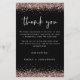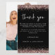 Obrigados Dourados Glitter do Rosa de Foto. Um tamanho maior de 5,5" x 8,5" a um preço orçamentário, em um STOCK CARD SEMI GLOSS de 110 lb, excelente de convites, aproximadamente na mesma espessura de um cartão postal, ou um estoque LINEN elegante de 110 lb - para um luxo, ligeiramente mais fino, com um valor de excelente. OBSERVE QUE OS ENVELOPES OPCIONAIS SÃO UM POUCO MAIORES EM TAMANHO A 6,75" x 9" aprox. Este alternativo de tamanho de orçamento também está disponível em outras opções de papel. O papel FELT de 100 lbs é colorido por buff, NÃO branco, então adiciona um toque rústico. O estoque de papel MATTE de 80 lbs é branco brilhante, para impressão nítida, excelente para os menus e programas, enquanto o papel SATIN de 80 lbs é fino e leve, ideal para gabinetes a brilhante rosa dourada Trendy faux borda as bordas superior e inferior e Obrigado por estar em um script de estilo de escrita manual com na moda sobre um fundo preto. Personalize facilmente o resto do texto. No verso, substitua a imagem de exemplo por uma favorita do seu partido.