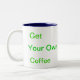 caneca de café feito-à-medida com guarnição azul. As palavras dizem que "obtenha seu próprio café" em 1 lado da caneca.