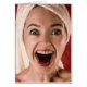 Uma mulher veste uma toalha em torno de sua cabeça após um chá e abre sua boca largamente no entusiasmo. Quem se importa o que a ocasião é! Este cartão cabe toda a ocasião feliz!