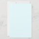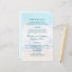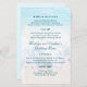 Cardápio de casamento com fundo de praia oceânica. Água azul-clara, espuma marinha e areia da praia são o pano de fundo para o texto azul-lacrimogêneo, personalizado. Os nomes da noiva e do noivo estão no centro do jornal. Personalize quatro seções com informações do menu.