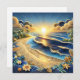 Representação de um pôr do sol do oceano com bonito ondas azuis, uma praia arenosa, palmeiras e flores feitas em um efeito 3D de coloração de papel.