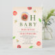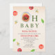 Tema da festa da pasta chá de fraldas Pizza & Pacificadores com Ilustração de uma placa de esparguete revestida com molho vermelho incorporado ao design "oh baby" com ilustrações de tomate, manjericão e pacificador em toda a parte.