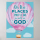 Bela ilustração colorida de balão de ar quente com tratamento moderno de tipografia em azul turquesa e branco sobre ilustração de balão roxo que diz, "Oh os Lugares que você irá COM DEUS!" O fundo é um céu xadrez com nuvens. Um lembrete de que se Deus está conosco, vamos realizar grandes coisas!