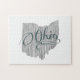 Um design de estilo vintage da forma do contorno do estado buckeye de Ohio encheu com um fundo de cinza de sentimento orgânico e o nome dos estados com fonte tipográfica. Muito obrigado por verificar esta quebra-cabeça de Tipografia do Estado de Ohio. Nós somos muito apreciativos pelo seu tempo e negócios.