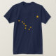 Versão mais recente das camisetas da bandeira do Alasca com estrelas ouros mais profundas. Letras de "Sinalizador do Alasca" escritas por Marie Drake Compostas por Elinor Dusenbury Oito estrelas de ouro num campo de azul, bandeira do Alasca, podem significar para vocês, O azul do mar, o céu noturno, os lagos de montanha e as flores próximas, O ouro dos sonhos da madrugada, O ouro precioso das colinas e riachos, As estrelas brilhantes O céu norte, o "Urso", o "Urso", e brilhando alto, o excelente Nordeste com sua luz estável, A terra de O'er e o mar um farol brilhante, a bandeira do Alasca aos Alaskans queridos, A bandeira simples da Última Fronteira.