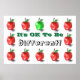 O texto diz: "Está tudo bem ser diferente!" neste sinal de poster com maçãs vermelhas bonitas, com uma maçã verde no meio, ilustração de borda, tudo sobre fundo branco. Ou personalizar com qualquer texto. O texto de aparência 3d verde e/ou a cor também podem ser facilmente alterados. A palavra "Diferente" está em outra letra que "Está Tudo Bem Ser". Crie facilmente sua própria mensagem pessoal, prêmio, ou assine, ou faça uma para o presente perfeito para alguém especial. Muitas possibilidades!