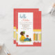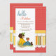 O convite de aniversário encantador de uma menina que descreve uma menina que senta-se na terra que diz o olá! a um pássaro. O fundo vermelho brilhante das bolinhas igualmente caracteriza um painel listrado e scalloped.