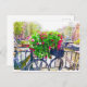 Este cartão postal apresenta uma cena do topo de uma ponte em Amsterdã, apresentando flores brilhantes e lindas, e bicicletas, que estão estacionadas ao longo da borda. Você pode ver edifícios ao fundo.