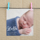 Simples cobertura de tipografia branca de Hello e sua linda fotografia de bebê neste cartão-postal de anúncio de nascimento de fotografia. Personalize este cartão fofo com detalhes de natalidade do seu filho ou menina e uma segunda fotografia para um cartão minimalista adorável. Foto de cheio sangrando na frente.