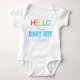 Camisa de criança para bebês bonita, de um tipo, com a redação, Olá, Novo Menino na Cidade. Alô está escrito em letras coloridas do arco-íris vermelho, laranja, amarelo, verde, azul. Outro texto está em azul claro. Design de Cota Original © 2017 TamiraZDesines