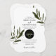 Esta design apresenta folhas e ramos de oliveira. O belo verde das folhas elogia a elegante forma negra e moderna do círculo ao redor da data do casamento. Uma fusão perfeita do moderno e chic com cores rústicas da azeitona. Verde-oliva, preto e branco são uma combinação perfeita para um casamento temático mediterrânico. Design de convite de casamento único com elementos modernos. Também estão disponíveis itens de papelaria de casamento e outros formatos de convite de casamento.