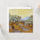 Oliveiras com céu amarelo e sol. Vincent Willem van Gogh. Paisagem em tons quentes de amarelo. Grande jardim com grandes árvores. Montanhas ao fundo. Há um grande sol brilhante no céu. Reprodução de obras de arte famosas em domínio público.