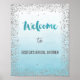 Poster impressão para sinal de boas-vindas com design de cintilação prateada falsa e fundo azul-água azul ombre.