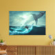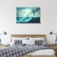 Arte na parede da canvas mostrada com uma impressão de arte fotográfica de um surfista cavalgando a onda entre tubarões. Personalize este item ou comprar como está. Imagem do stock