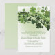 Um arranjo encantador de fitas verdes e ondas de trevos de quatro folhas multicoloridos contra um fundo branco. Um convite sazonal para qualquer celebração. O cartão é fácil de personalizar com sua redação, fonte, cor da fonte e escolha de seis tipos de papel.