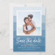 Breezy e belo salve a data design apresenta a sua foto de noivado favorita emoldurada em branco contra um fundo azul de faixa de cor-d-água. Personalize com seus nomes, data de casamento, local e site de casamento ou informações de convite. Uma foto de chic e verão salvou o cartão de data para casamentos de praia, casamentos de verão ou casamentos de destino.