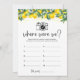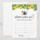 Adicione um pedaço de diversão ao seu chá de panela com o nosso Cartão de Jogo de Chá de panela Onde Estávamos, Lemon, com um design de aquarela moderno com sotaques vibrantes de citros amarelos e verdes. Este jogo divertido convida os convidados a adivinhar lugares memoráveis do passado do casal, fazer-o como uma adição encantadora e interativa à sua celebração com o tema limão!