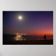 Um casal beija numa praia ao anoitecer. O sol está se pondo e a lua e as estrelas estão saindo.