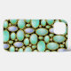 Um bonito padrão de pingente de broche opal com correntes douradas. Este design impresso único é feito para parecer com opais azuis turquesas dispostos em uma espécie de mosaico sobre um fundo preto, personalizável. As formas ovais têm um aspecto opaco de mãe de pérola com espirais de azul, verde e branco. É um belo padrão original.