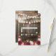 Cartões de RSVP de casamento no campo com fundo de barril de madeira rústica, luzes cintilantes, flores em aquarela burgundy e rosa, seu