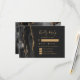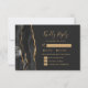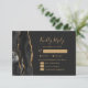 A borda esquerda deste elegante cartão de cercado RSVP de casamento moderno apresenta uma borda preta de aquarela, aparada com falso brilho dourado. O título "Resposta gentil" aparece em um script de escrita manuscrita dourado, com o texto restante em fontes copperplate e itálico em um fundo fora de preto. Inclui espaços para seus convidados iniciarem sua escolha de três entradas editáveis. O verso apresenta um design de agate preto e dourado correspondente.