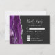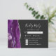 A borda esquerda deste elegante cartão de cercado RSVP de casamento moderno apresenta uma borda agitada com cor d'água roxa, aparada com falso brilho prateado. O título "Resposta gentil" aparece no script de escrita manual de cinzas prateadas, com o texto restante em fontes em copperplate e itálico em um fundo fora do preto. Inclui espaços para seus convidados iniciarem sua escolha de três entradas editáveis. O verso apresenta um design de agata prateado e roxo correspondente.