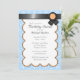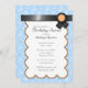 Belos convites de festas com uma cor damasco azul-clara e branca e um design de fita preto com laranja no topo.