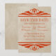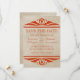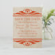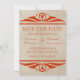 Na moda e chic Elegant Deco Salve o Anúncio de data apresentando um par de espiral de arte deco floresce em laranja escuro e um fundo de aparência texturizado em um bege suave. Isto salve o convite para a data tem charme rústico enquanto mantém um belo talento sofisticado. Absolutamente perfeito para o casamento temático vintage de 1920. Fácil de personalizar, basta adicionar os detalhes do casamento nos campos de texto fornecidos. Clique em "Personalizar" para encontrar mais opções de personalização, como alterar fontes ou cores de texto.