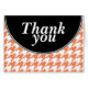 Estas placas de propósito, todas clássicas, agradecidas a vocês são desenhadas com "obrigado você" em letras brancas em itálico em negrito em um semicírculo preto sobre um padrão de som branco e laranja. Este padrão é uma escolha na moda para Casamentos, Chás de panela e Anniversários. O dentro é impresso por personalização com seu próprio texto ou o texto modelo pode ser facilmente apagado para deixar o dentro dessas placas vazio para manuscrito seus sentimentos de obrigados. Sem ordem mínima. São aplicáveis descontos em massa.