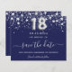 Uma cinta e uma moda Salve a placa Date para uma festa de aniversário 18th. Um fundo azul marinho colorido. Decorado com estrelas de falso prata. O texto: Salvar a Data é gravado com um script de estilo com letra de tendência grande. O número 18 é escrito com uma fonte no estilo do balão.