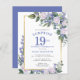 Honra uma mulher especial com este elegante e feminino Orçamento 19 Aniversário de Convite de festas Surpresa. Surpresa e 19º estão escritas em grande texto azul. A Celebração de Aniversário segue. O nome do convidado também está em letras azuis. Os detalhes da comemoração de aniversário estão rodeados por um quadro de ouro chico. As flores azuis e as rosas brancas estão aninhadas em folhas verdes profundas.