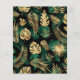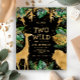 Celebrar o segundo aniversário da sua coisa selvagem com este convite temático safari da selva, que inclui folhas de ouro falsas (girafa, leão e macacos), folhagem dourada e selva verde, e uma aspersão de confete dourado. Adicione o nome do seu filho e os detalhes da festa em texto dourado sobre fundo preto. Um padrão de folhagem em verde e dourado em fundo preto decora a parte de trás da carta.