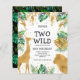 Celebrar o segundo aniversário da sua coisa selvagem com este convite temático safari da selva, que inclui folhas de ouro falsas (girafa, leão e macacos), folhagem dourada e selva verde, e uma aspersão de confete dourado. Adicione o nome do seu filho e os detalhes da festa em texto preto sobre um fundo branco. Um padrão de folhagem em verde e dourado em fundo preto decora a parte de trás da carta.
